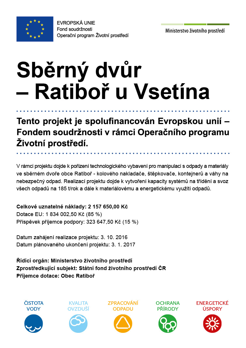 Projekt SBĚRNÝ DVŮR – RATIBOŘ U VSETÍNA je spolufinancován Evropskou unií – Fondem soudržnosti v rámci Operačního programu Životní prostředí.
