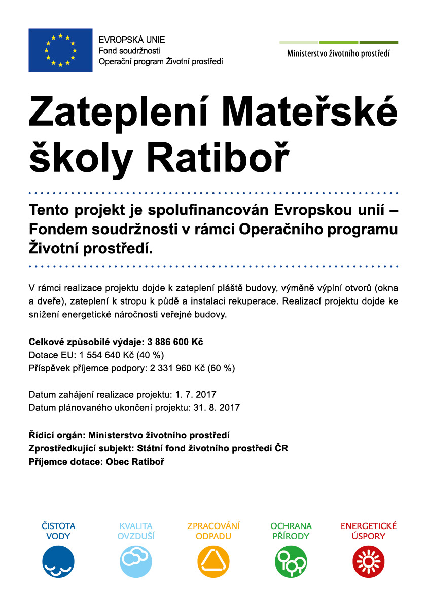 Projekt ZATEPLENÍ MATEŘSKÉ ŠKOLY RATIBOŘ je spolufinancován Evropskou unií – Fondem soudržnosti v rámci Operačního programu Životní prostředí.