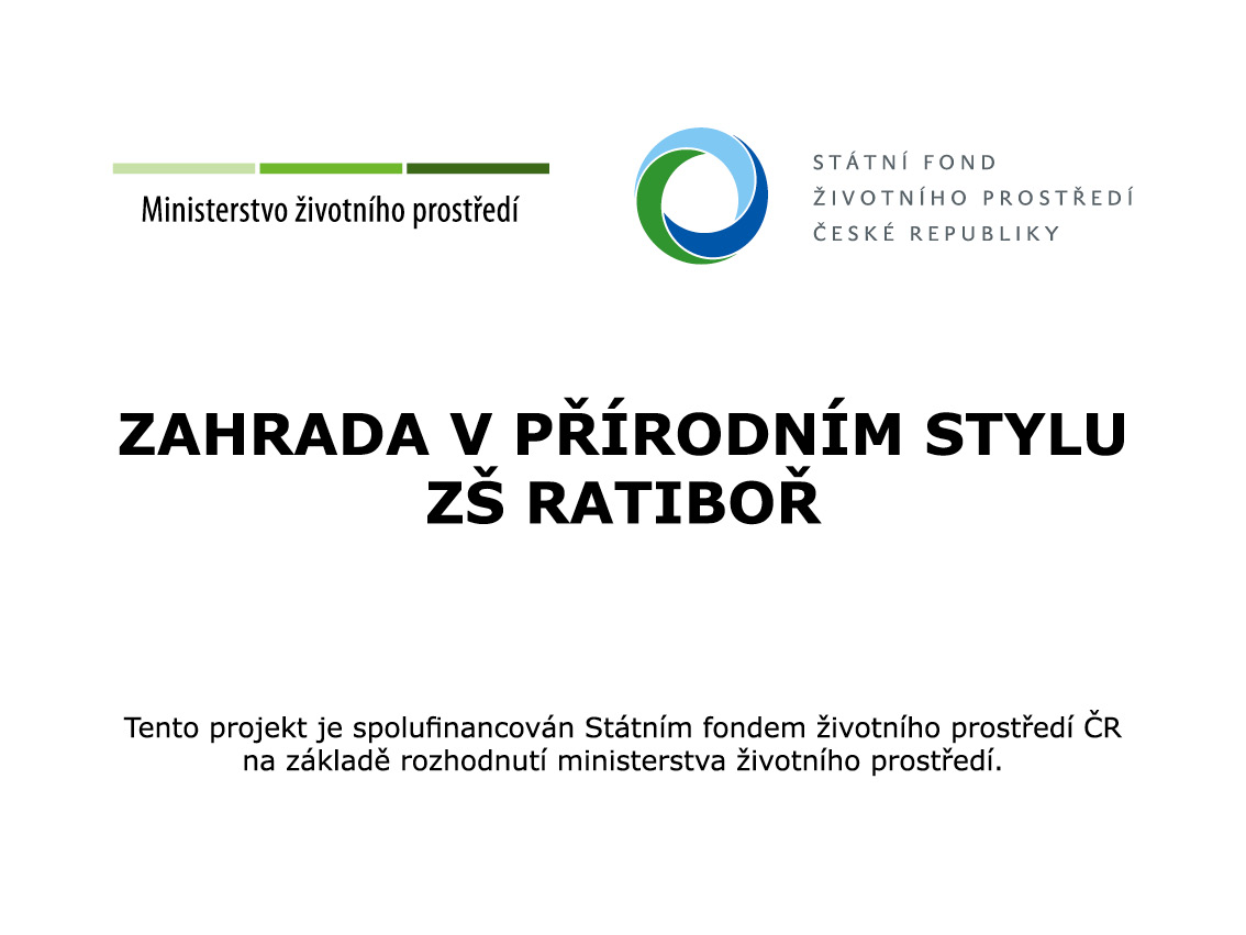 Projekt ZAHRADA V PŘÍRODNÍM STYLU ZŠ RATIBOŘ je spolufinancován Státním fondem životního prostřední České republiky (www.sfzp.cz) na základě rozhodnutí ministra životního prostředí (www.mzp.cz).