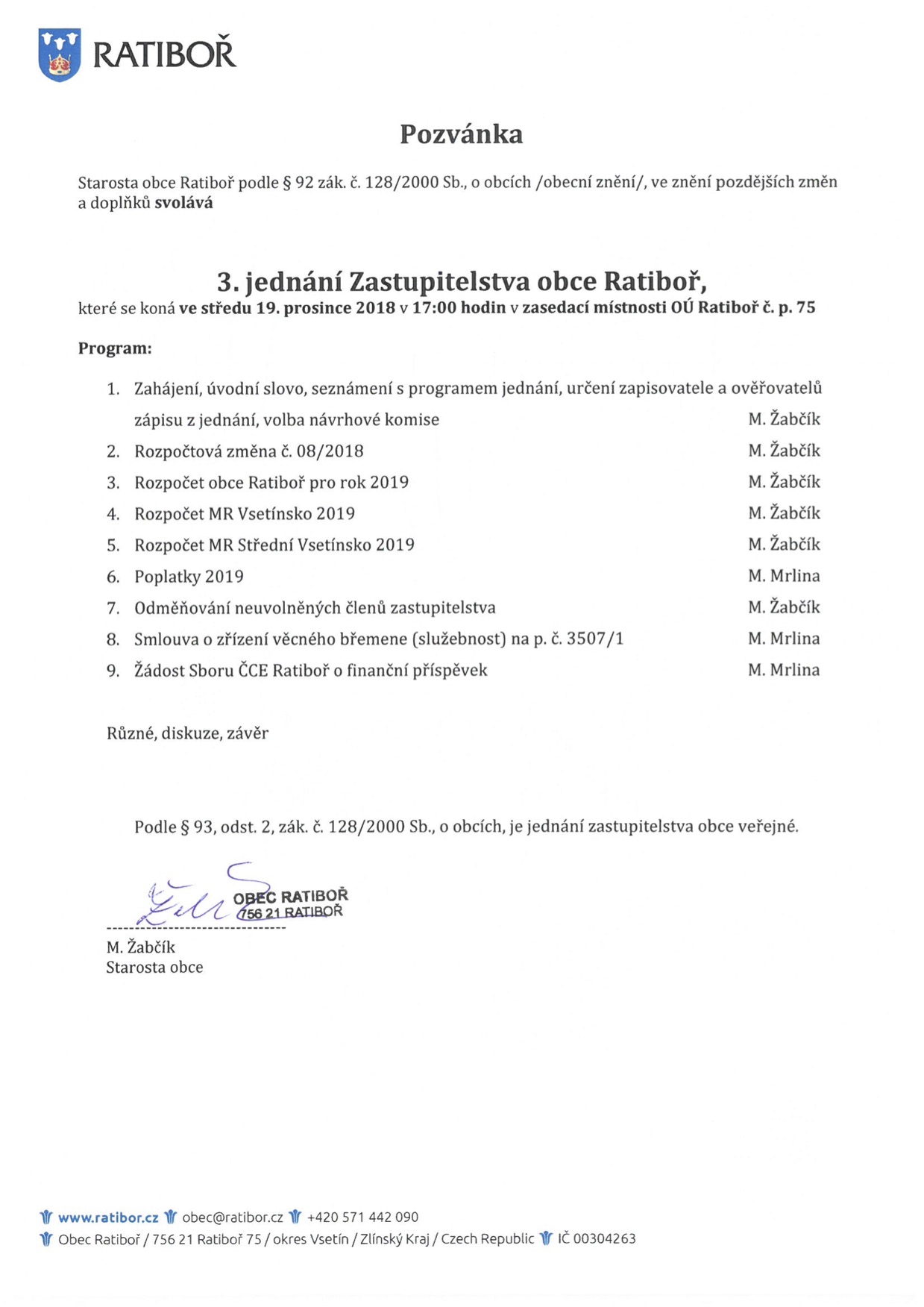 Pozvánka na 3. jednání Zastupitelstva obce Ratiboř, které se koná ve středu 19. prosince 2018 od 17 h v zasedací místnosti OÚ Ratiboř 75. Program jednání v přiloženém dokumentu.