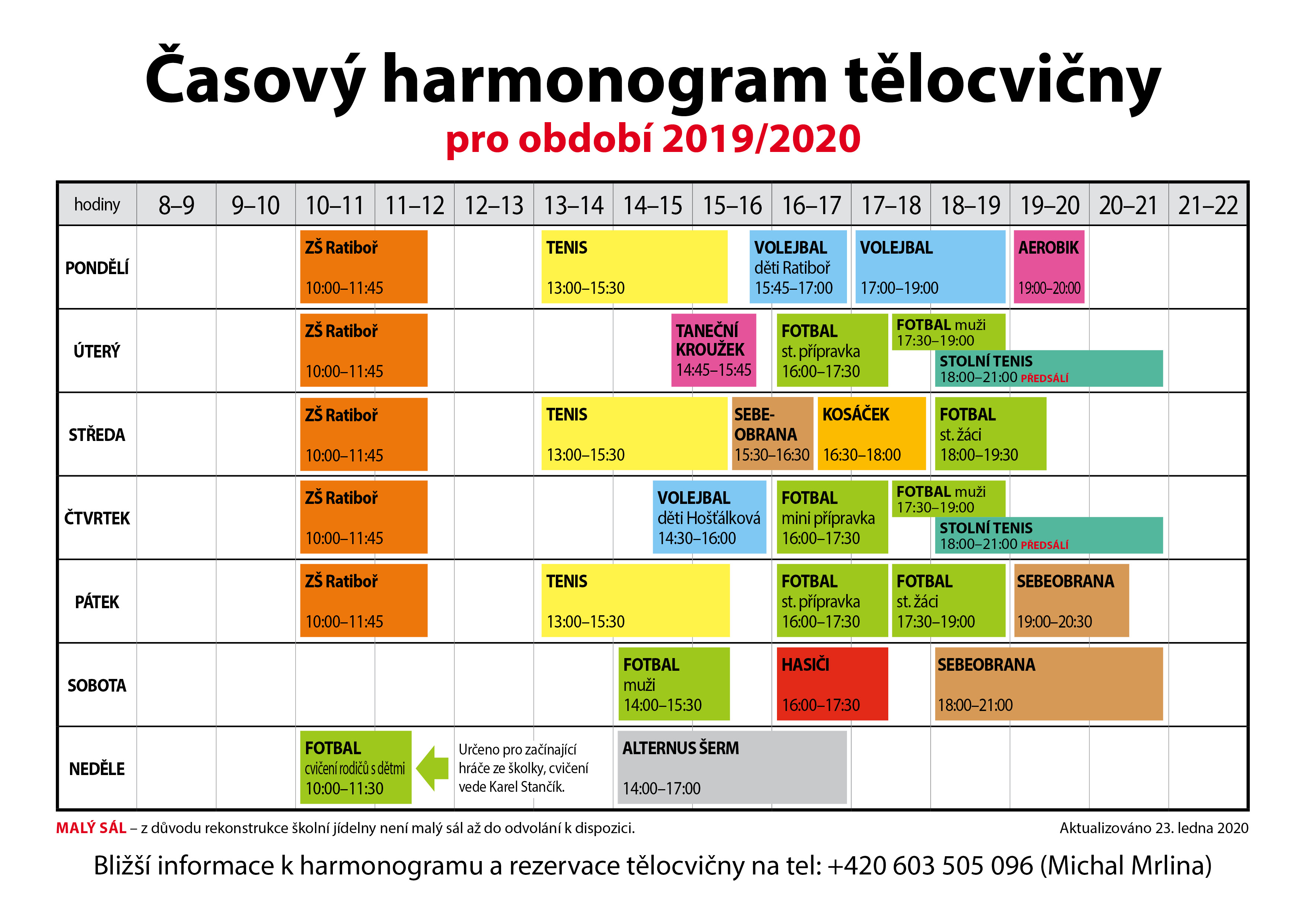 Bližší informace k harmonogramu a rezervace tělocvičny na tel: +420 603 505 096 (Michal Mrlina).